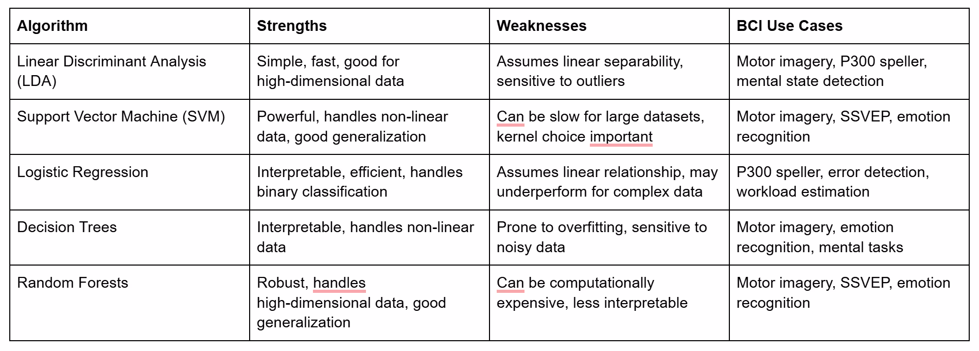 The best classification algorithm for your BCI application depends on several factors, including the nature of your data, the complexity of the task, and the desired balance between accuracy, speed, and interpretability. Here's a table comparing some common algorithms: